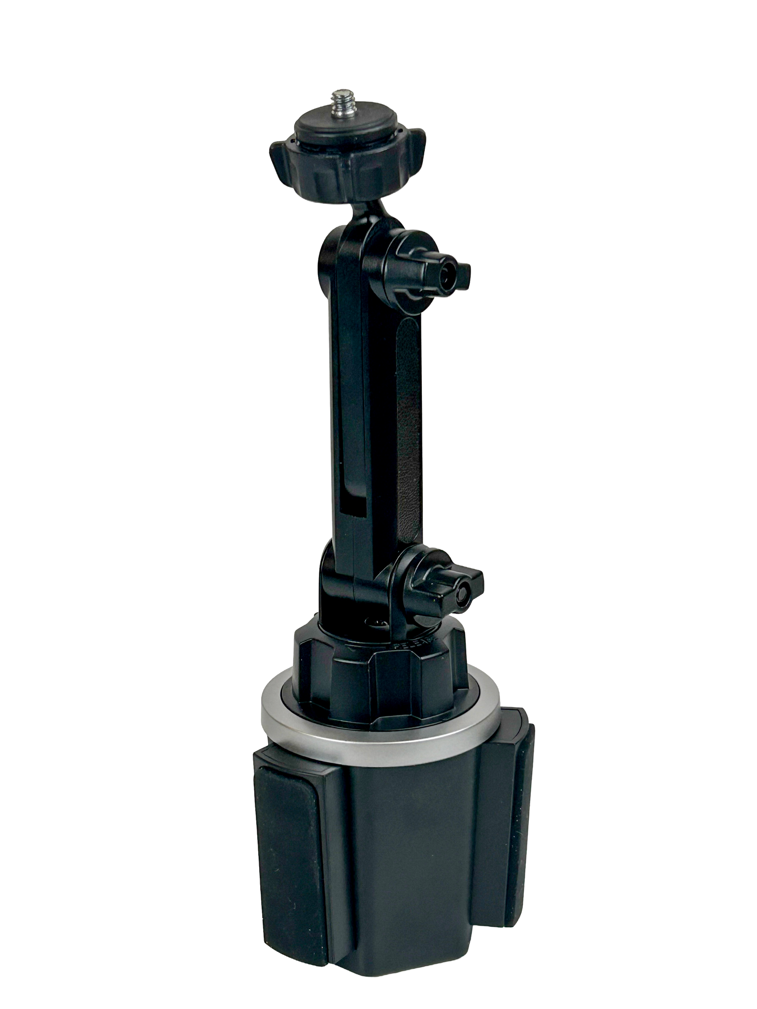 The cup holder mount base can be expanded from 2.5" to 3.5" to fit most cup holder. The height can be adjusted along with several angle adjustments. The connection to the remote head sits on a ball, this enables the user to swivel the control head to get the perfect view.
